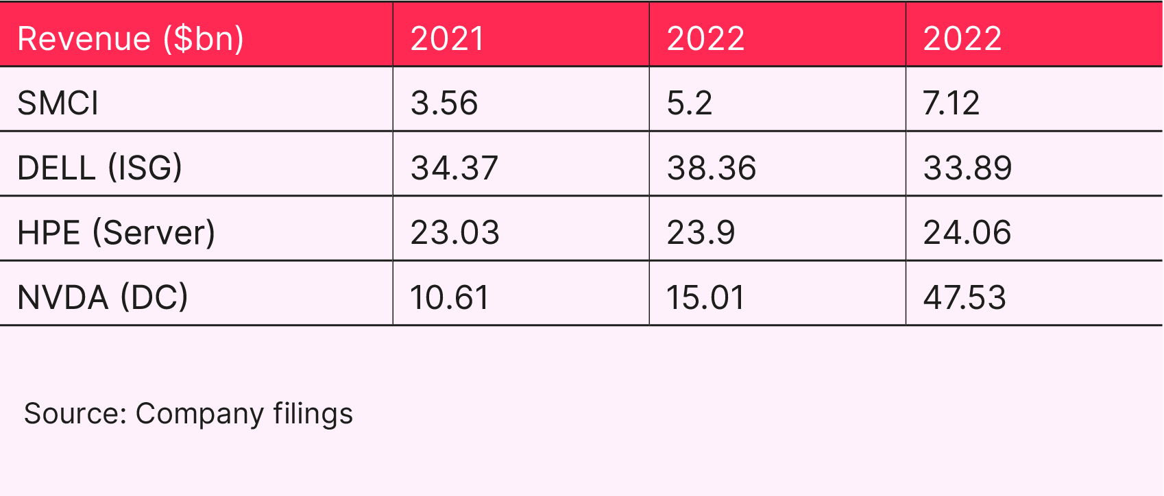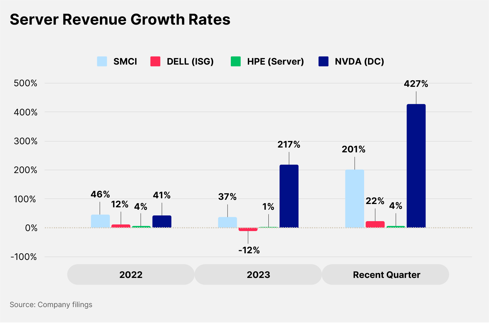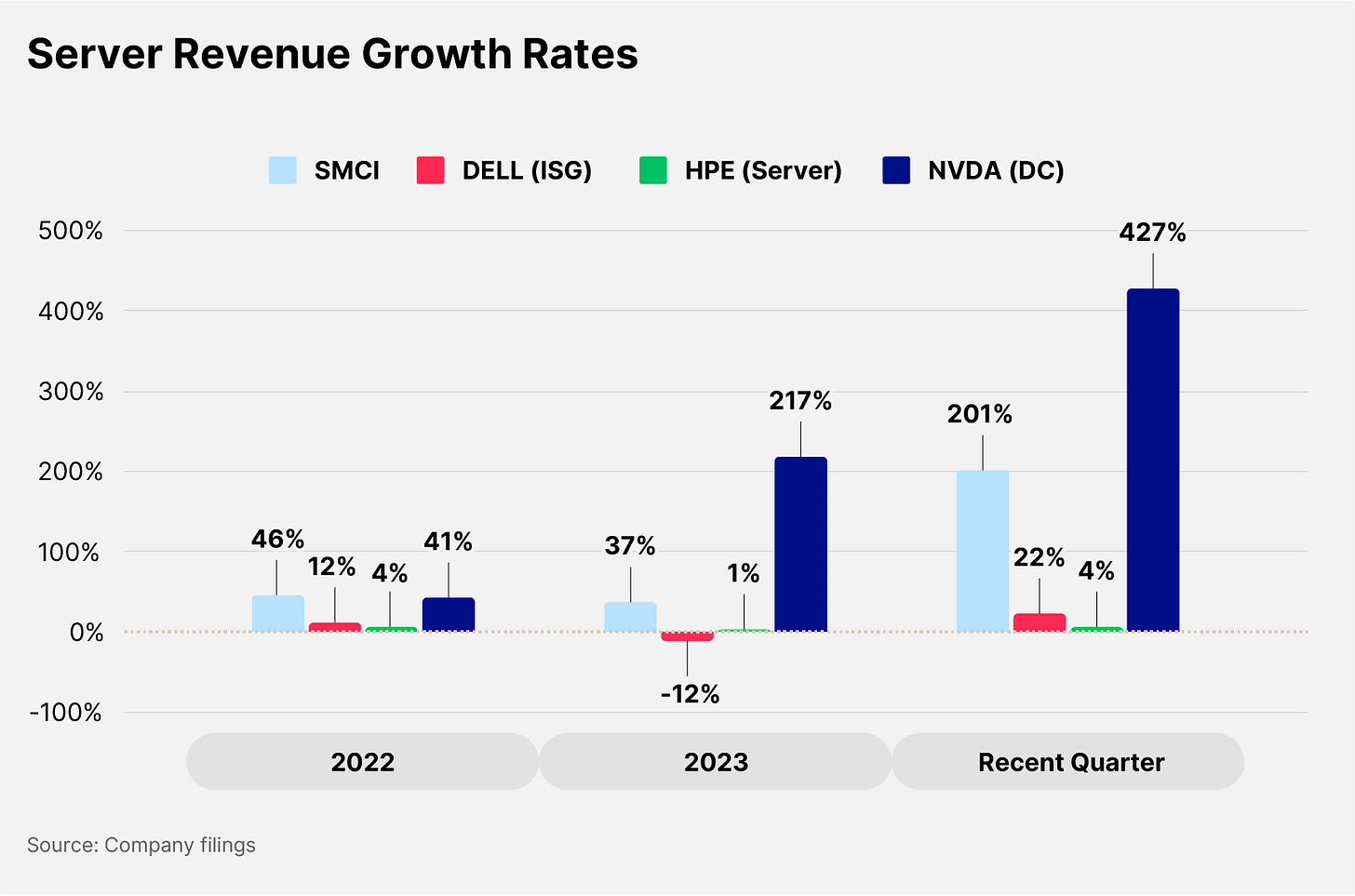 However, Super Micro’s revenue in the most recent quarter increased by 201% year-over-year. Nvidia’s data center revenue increased more than twice as fast — 427% year-over-year19 — but Dell’s ISG revenue only increased 22% year-over-year,20 while HPE’s server revenue increased 17.6%.21