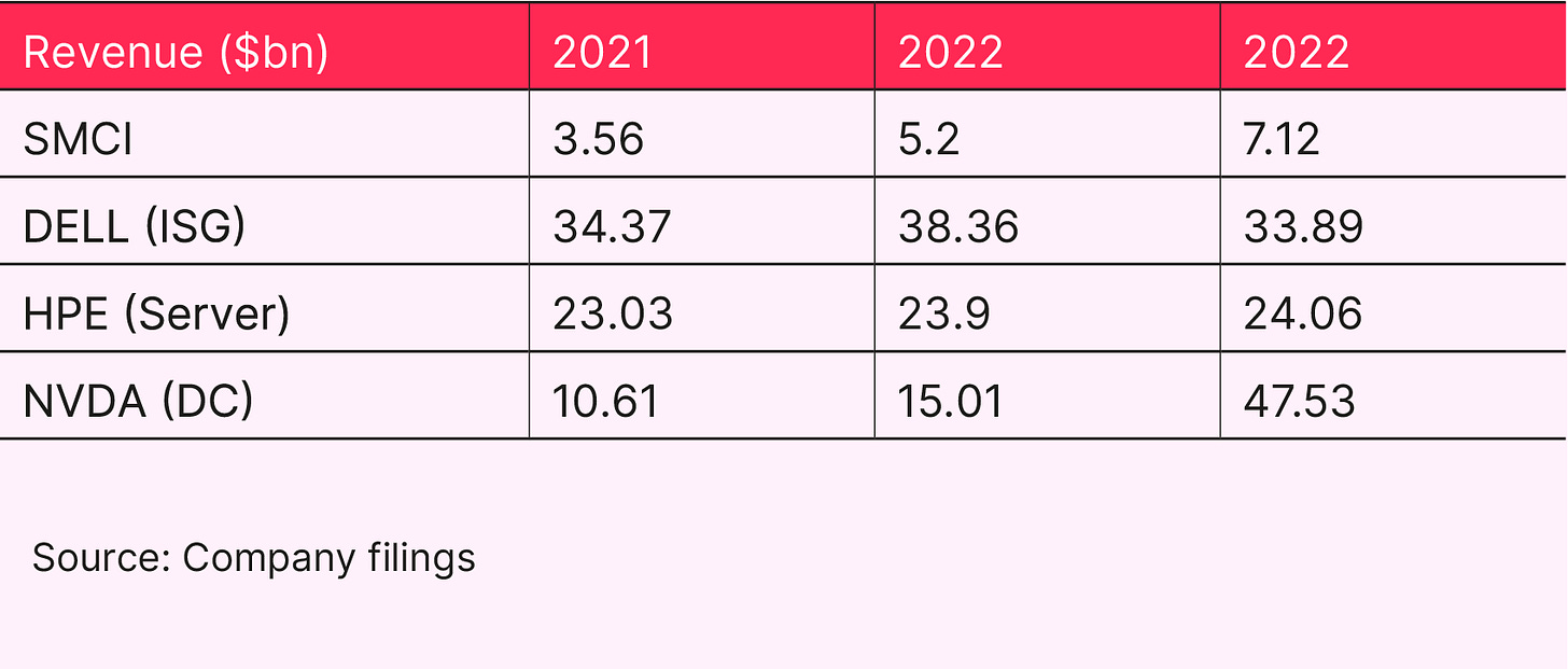 The trend seems clear. Nvidia’s server revenue growth is increasing rapidly and taking Super Micro’s with it (though at a slower rate). Both are eating into the market share of the industry’s two largest incumbents in the process.
