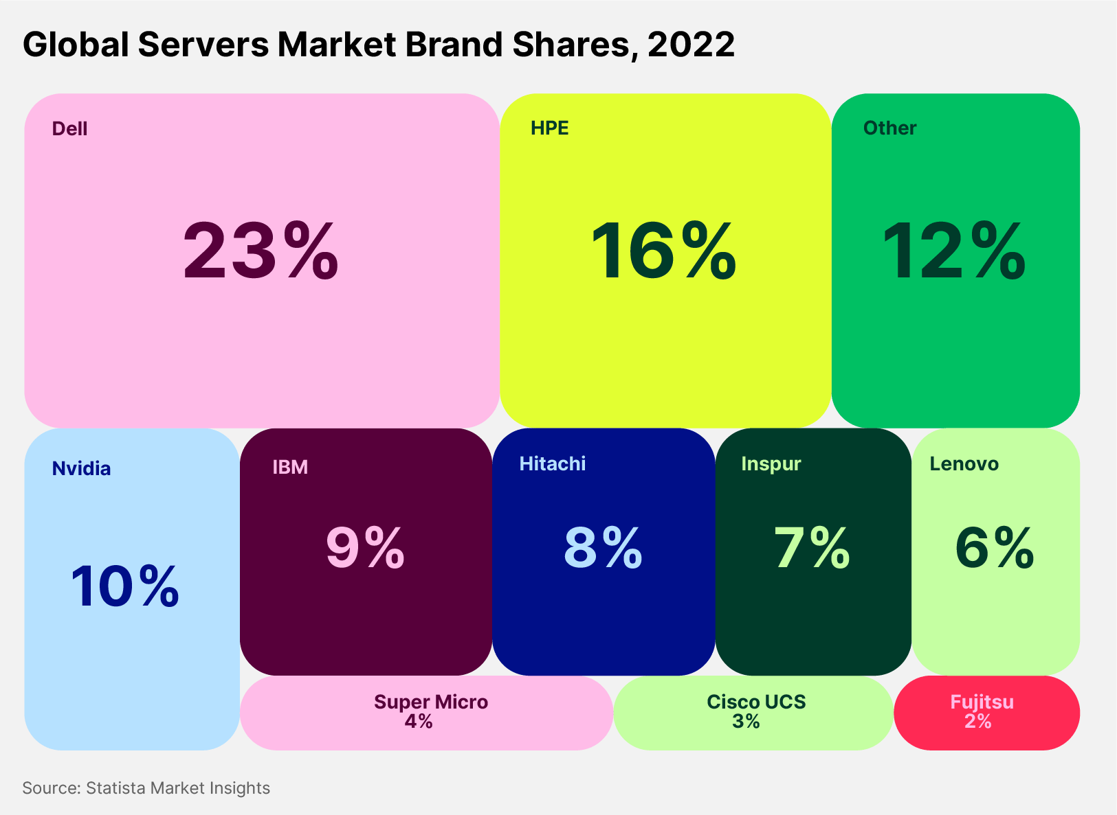 According to Statista, in 2022, the largest players in the data center server market were Dell, with 23% of the market, Hewlett Packard Enterprise [HPE] with 16%, and Nvidia with 10%. Super Micro took 4% of the market during that year, making it the eighth-largest company by market share.15