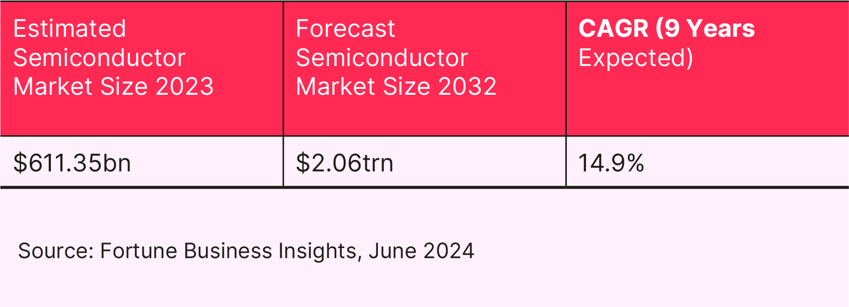 Fortune Business Insights values the global semiconductor market size at $611.4bn in 2023, and projects it will grow to $2.1trn by 2032 at a CAGR of 14.9%.5