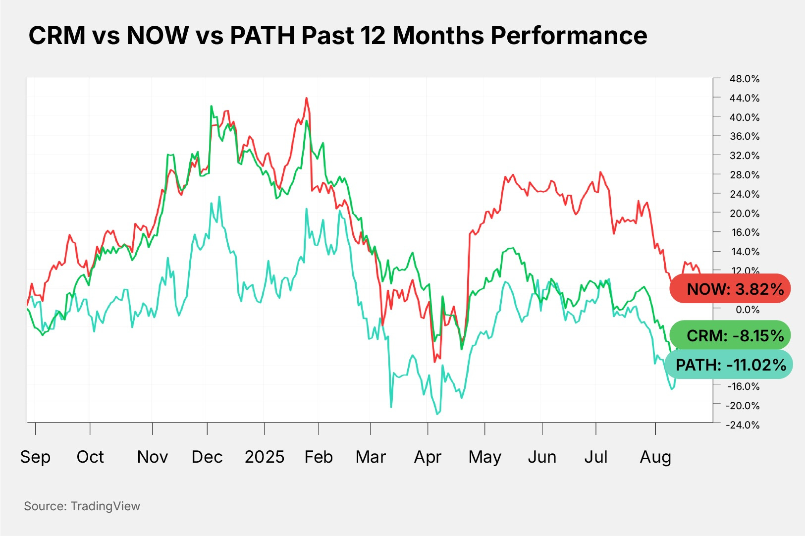 CRM stock has fallen 26.86% since January 1 through August 26 and is down 9.43% in the past month. NOW stock is down 18.43% year-to-date and down 10.74% in the past month. PATH stock has fallen 14.87% and 11.16% in the respective periods.